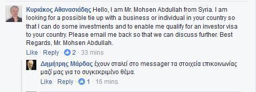 Το μήνυμα του… επενδυτή: «Hello, I am Mr. Mohsen Abdullah from Syria. I am looking for a possible tie up with a business or individual in your country so that I can do some investments and to enable me qualify for an investor visa to your country. Please email me back so that we can discuss further. Best Regards, Mr. Mohsen Abdullah (μτφ. Γεια σας, είμαι ο κ Μοχσέν Abdullah από τη Συρία. Ψάχνω για μια πιθανή συνεργασία με μια επιχείρηση ή άτομο στη χώρα σας, ώστε να μπορώ να κάνω κάποιες επενδύσεις και να μου επιτραπεί επενδυτική βίζα στη χώρα σας. Παρακαλώ στείλτε μου πίσω για να μπορέσουμε να συζητήσουμε περαιτέρω. Με τις καλύτερες ευχές, κ Μοχσέν Abdullah)».