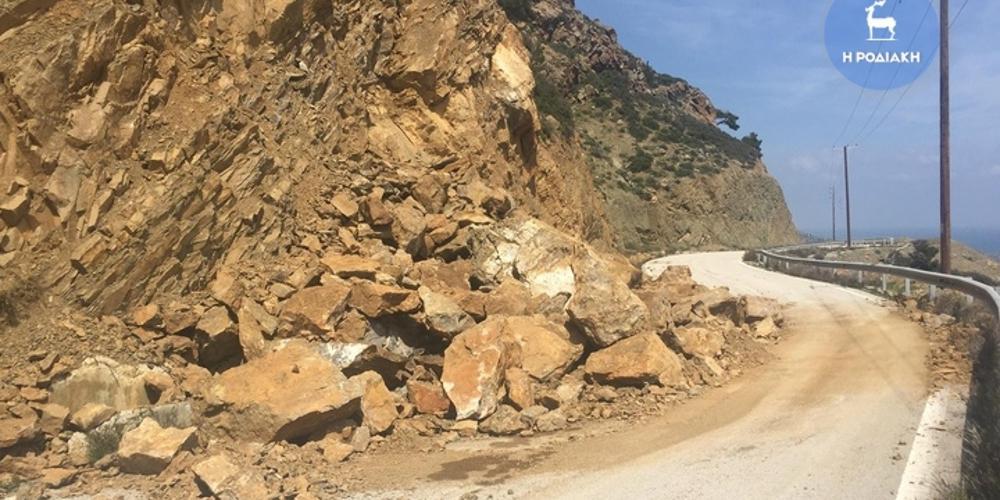 Συνεργεία με τέσσερα μηχανήματα της Πολιτικής Προστασίας της Περιφέρειας Νοτίου Αιγαίου βρίσκονται στο οδικό δίκτυο προσπαθώντας να αποκαταστήσουν την κυκλοφορία απομακρύνοντας τις πέτρες από καταπτώσεις.