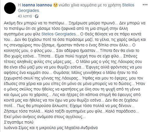 Την είδηση του θανάτου του έκανε γνωστή η makeup artist Ιωάννα Ιωάννου με μια ανάρτηση της στον λογαριασμό της στο Facebook γράφοντας για τον αγαπημένη της φίλο: «Ακόμη δεν μπορώ να το πιστέψω… Ξημέρωσε μαύρο πρωινό… Δεν μπορώ να το πιστέψω ότι σε χάσαμε τόσο ξαφνικά από τη μια στιγμή στην άλλη αγαπημένε μου φίλε Stelios Georgiades… Ο Θεός θέλησε να σε πάρει κοντά του… Δεν θα ξεχάσω ποτέ τα όσα περάσαμε μαζί, τα γέλια, τις χαρές ακόμη και τις στεναχώριες που ζήσαμε, ήμασταν πάντα ο ένας δίπλα στον άλλο… Ο κολλητός μου, ο φίλος μου… Σαν αδέρφια ήμασταν… Τίποτα δεν θα είναι το ίδιο χωρίς εσένα… Τίποτα… Είμαι πολύ τυχερή που σε είχα φίλο… Σπάνιες τέτοιες αληθινές φιλίες στις μέρες μας… Ο Μάλο μας ο γιός της Λάουρας σου θα είναι εδώ μαζί μου να μου θυμίζει εσένα… Έφυγες αλλά φρόντισες να μου αφήσεις ένα κομμάτι σου… Θυμάσαι; Μόλις γεννήθηκε ο Μάλο ήταν το πιό ξεχωριστό σκυλί της γέννας της Λάουρας… Ήρθες και μου το έφερες, μου τον έδωσες στα χέρια και μου είπες ότι μόνο σε μένα μπορείς να το δώσεις… Ήταν ο μόνος σκύλος που ήθελες να κρατήσεις με όλη σου τη ψυχή από τη γέννα και όμως μου το χάρισες… Λες και ήξερες ότι κάποια στιγμή θα έφευγες από κοντά μας και ήθελες να τον έχω να μου θυμίζει εσένα… Δεν θα σε ξεχάσω ποτέ… Πως θα μπορούσα άλλωστε; Είχαμε τόσα πολλά να μας δένουν… Ζήσαμε τόσα πολλά… Καλό ταξίδι αγαπημένε μου φίλε…Καλό παράδεισο… Εκεί μόνο ανήκεις ανάμεσα στους αγγέλους… Σ’αγαπάμε πολύ».