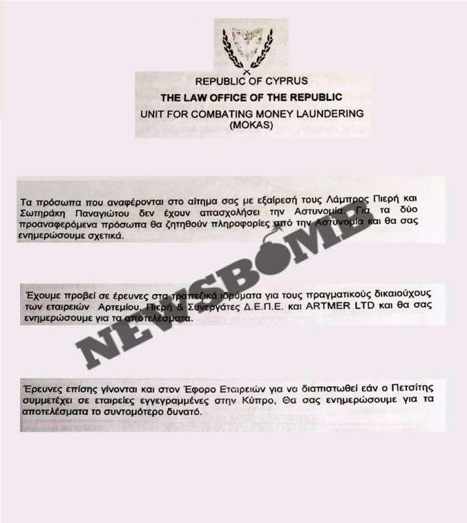 Όπως αναφέρεται σε έγγραφο που δημοσιεύθηκε στην ιστοσελίδα newsbomb, οι αρμόδιες αρχές της Κυπριακής Δημοκρατίας έχουν ξεκινήσει να ερευνούν τις δραστηριότητες του Μανώλη Πετσίτη στην Κύπρο και ειδικά τις σχέσεις του με τους περίφημους δικηγόρους των offshore του Λαυρέντη Λαυρεντιάδη, Άρτεμη Αρτεμίου, Λάμπρο Πιερή και Σωτηράκη Παναγιώτου.
