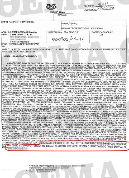 Στην αναφορά, που φέρει ημερομηνία 5.4.19 και χαρακτηρίζεται ως «επείγουσα», περιγράφεται αναλυτικά το όλο συμβάν που ξεκίνησε στις 17:40 με τον εντοπισμό στο blue star 1 ενός υπηκόου Συρίας με 218 γραμμάρια ακατέργαστης κάνναβης που κατέληξε στην πλατεία Εξαρχείων με το “φιάσκο” και το ξεγύμνωμα των οκτώ λιμενικών.