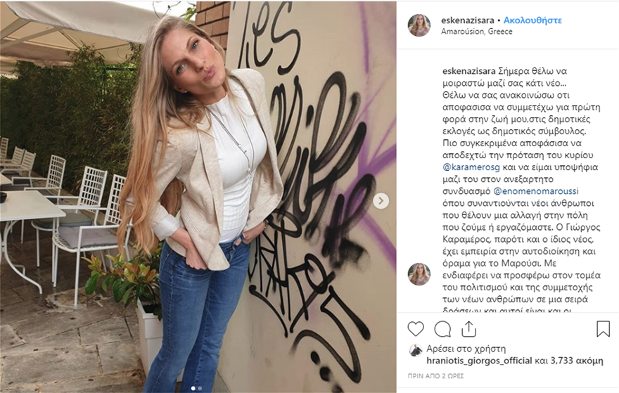 Ο Γιώργος Καραμέρος, παρότι και ο ίδιος νέος, έχει εμπειρία στην αυτοδιοίκηση και όραμα για το Μαρούσι. Με ενδιαφέρει να προσφέρω στον τομέα του πολιτισμού και της συμμετοχής των νέων ανθρώπων σε μια σειρά δράσεων και αυτοί είναι και οι βασικοί λόγοι της υποψηφιότητάς μου.