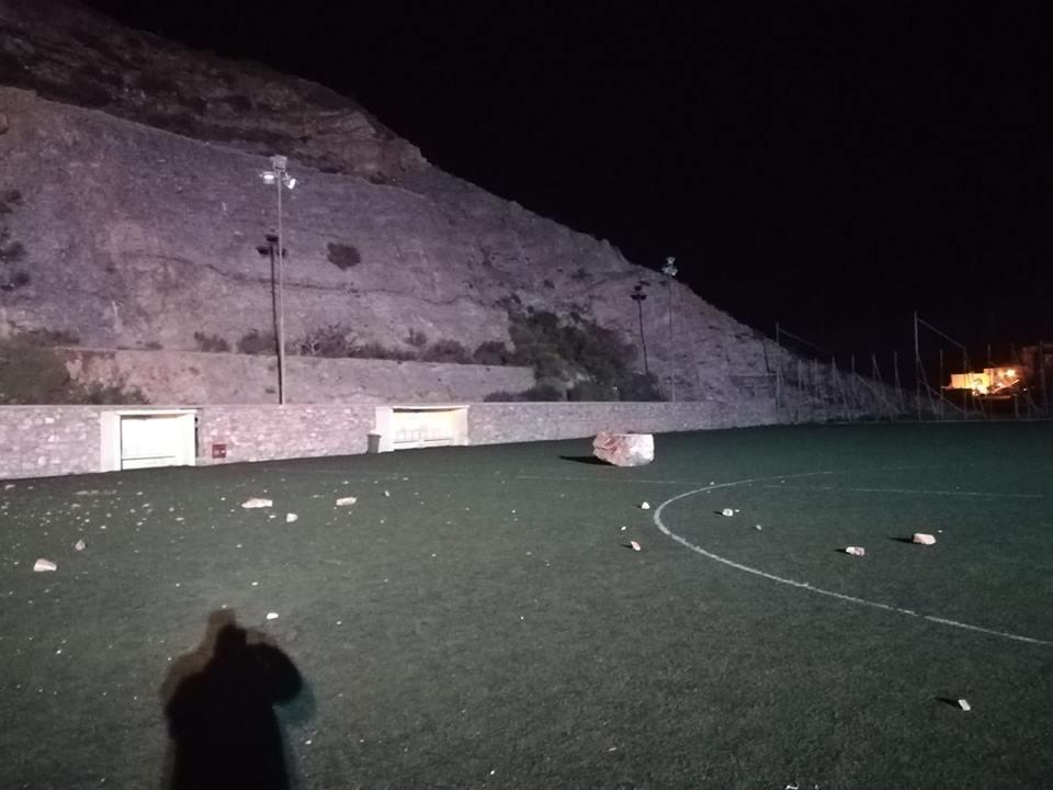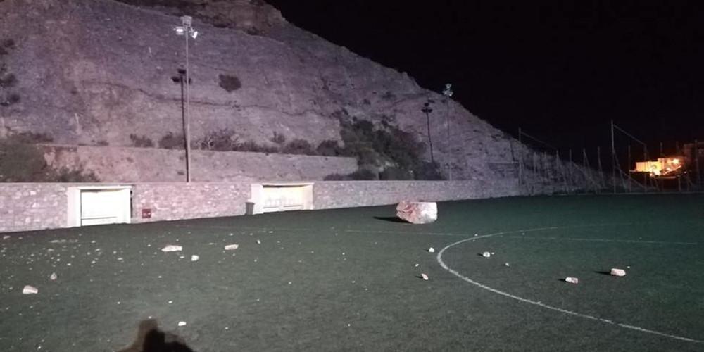 Ένας τεράστιος βράχος και άλλοι μικρότεροι οι οποίοι βρίσκονταν εκτός της αθλητικής εγκατάστασης και σε ύψος αρκετών μέτρων, υποχώρησαν ξαφνικά με αποτέλεσμα να βρεθούν εντός του αγωνιστικού χώρου προκαλώντας, ευτυχώς, μόνο υλικές ζημιές. Τα βράχια υποχώρησαν από την πλαϊνή πλευρά του γηπέδου.