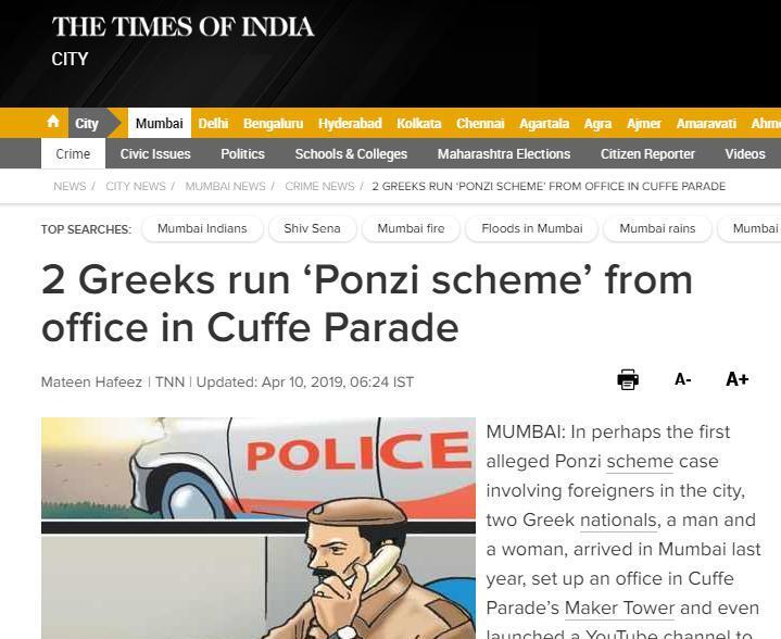 Το ρεπορτάζ των Times of India, φιλοξενεί μάλιστα και δηλώσεις αστυνομικού ο οποίος αναφερόμενος στην υπόθεση τονίζει: «Η εταιρεία έχει κανάλι στο YouTube για να προσελκύει επενδυτές. Οι αντιπρόσωποι παρέχουν πληροφορίες για το πώς να συνδεθούν με την εταιρεία και να αποκομίσουν κέρδος. Εξετάζουμε όλα τα βίντεο που έχουν αναρτηθεί και θα τα συμπεριλάβουμε στην αναφορά μας».