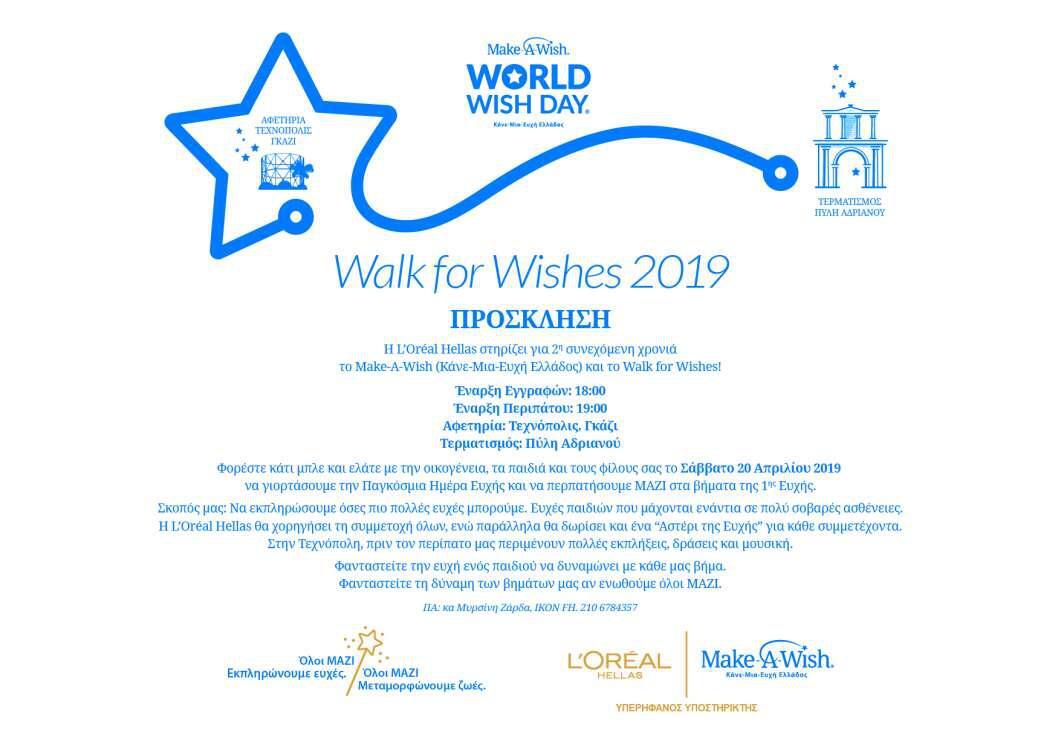 Αφετηρία θα αποτελέσει ο εορτασμός της Παγκόσμιας Ημέρας Ευχής. Η L’Oréal Hellas θα είναι και φέτος ο μεγάλος χορηγός του Walk-For-Wishes, του φιλανθρωπικού περιπάτου για την εκπλήρωση ευχών παιδιών με πολύ σοβαρές ασθένειες, που θα πραγματοποιηθεί το Σάββατο 20 Απριλίου 2019. Φέτος, ο περίπατος θα ξεκινήσει από την Τεχνόπολις του Δήμου Αθηναίων και θα καταλήξει στην Πύλη του Αδριανού. Η L’Oréal Hellas, στηρίζοντας με υπερηφάνεια το έργο του Make-A-Wish (Κάνε-Μια-Ευχή Ελλάδος), θα χορηγήσει τη συμμετοχή όλων των πολιτών, ενώ παράλληλα θα δωρίσει και ένα «Αστέρι Ευχής» για κάθε συμμετέχοντα.