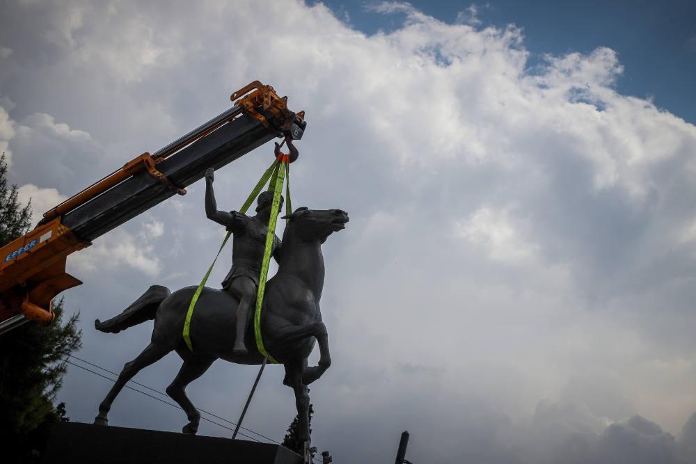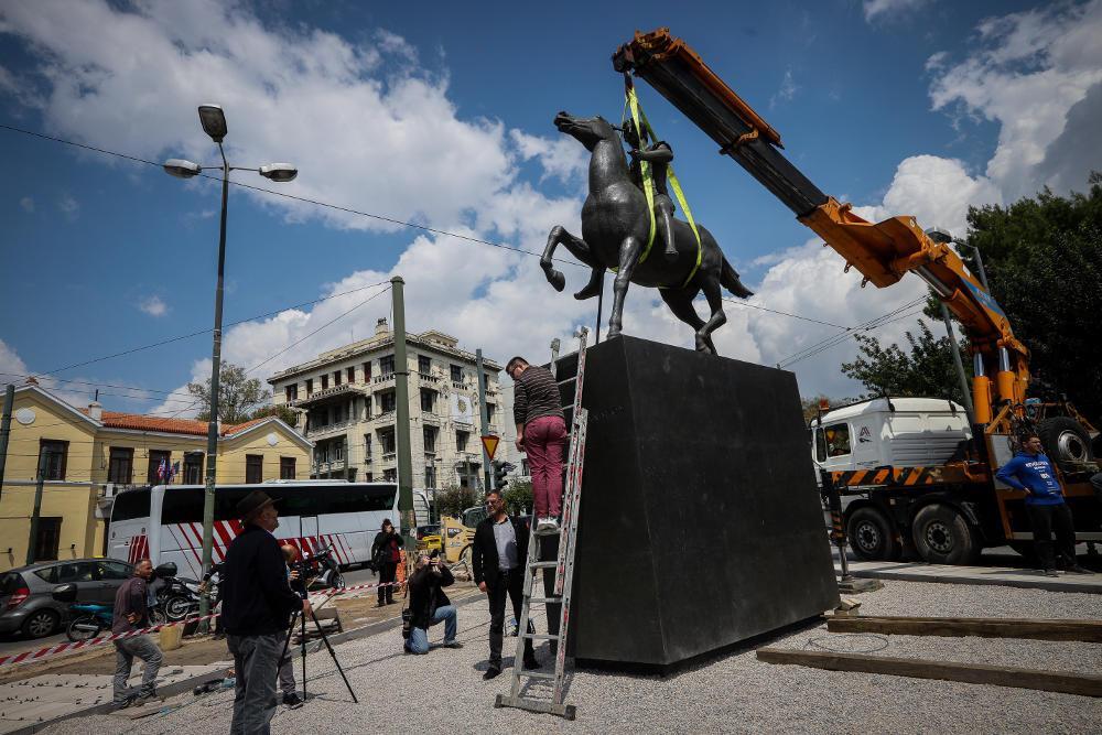 Το άγαλμα παρουσιάζει έφιππο τον Μέγα Αλέξανδρο και οι εργασίες τοποθέτησής του ολοκληρώθηκαν το μεσημέρι της Τετάρτης. Πρόκειται για έναν ανδριάντα του Μακεδόνα στρατηλάτη που έχει φιλοτεχνήσει ο γλύπτης Γιάννης Παππάς.