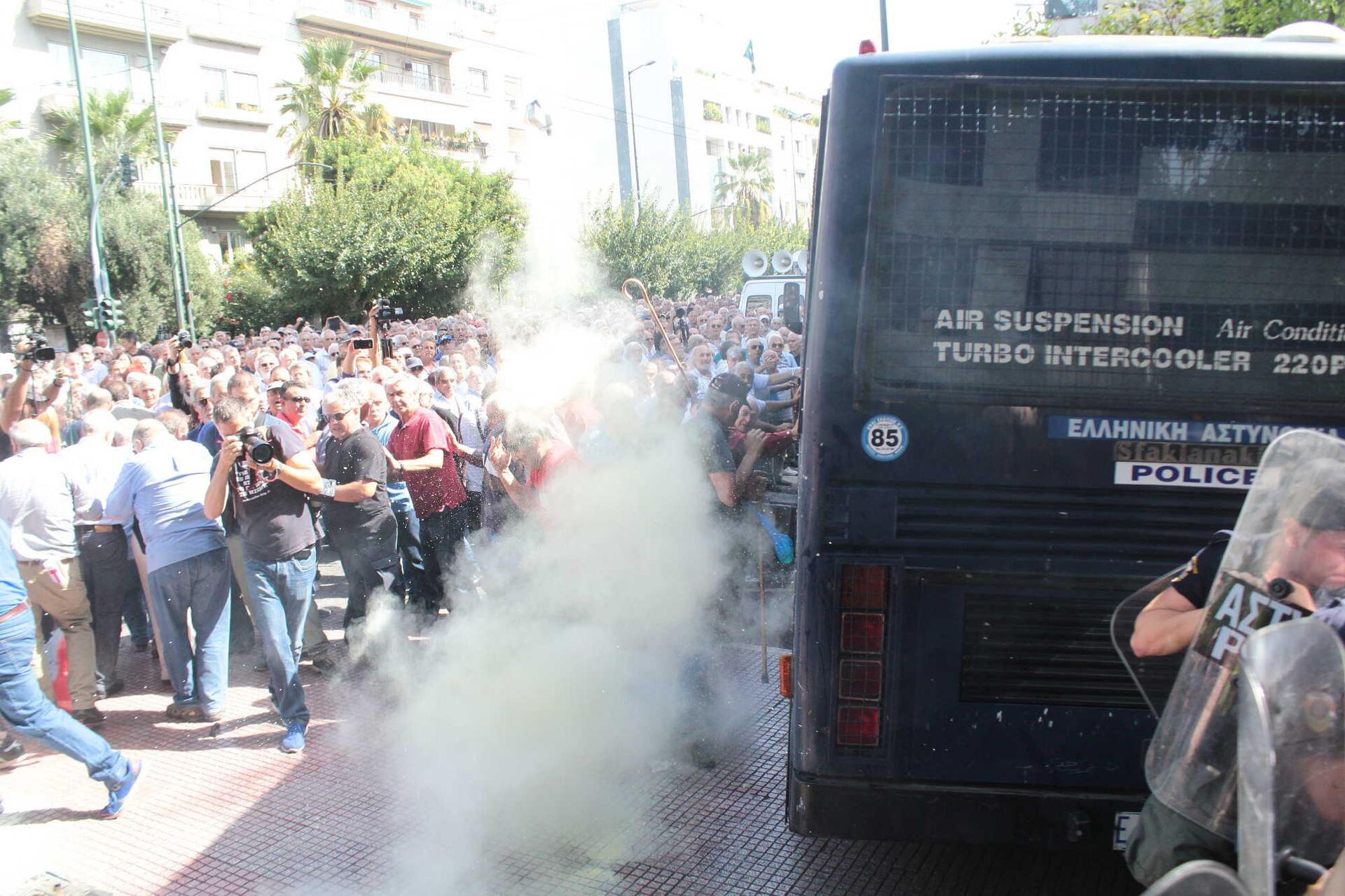 Αμέσως ξέσπασαν επεισόδια: Οι συνταξιούχοι επιχείρησαν να περάσουν προσπαθώντας ταυτόχρονα να ρίξουν, ωθώντας, τη μία κλούβα η οποία ήταν παρατεταγμένη και οι αστυνομικοί προχώρησαν σε εκτεταμένη χρήση χημικών κατά των ηλικιωμένων διαδηλωτών.
