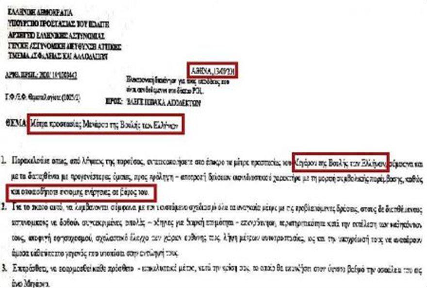 Το έγγραφο της ΕΛ.ΑΣ., με τίτλο «Μέτρα Προστασίας του Μεγάρου της Βουλής των Ελλήνων» αναφέρει μεταξύ άλλων: «Παρακαλούμε όπως, από λήψεως της παρούσας, να εντατικοποιήσετε στο έπακρο τα μέτρα προστασίας του Μεγάρου της Βουλής των Ελλήνων προς πρόληψη και αποτροπή δράσεων αιφνιδιαστικού χαρακτήρα με τη μορφή συμβολικής παρέμβασης κι οποιασδήποτε έκνομης ενέργειας σε βάρος του».