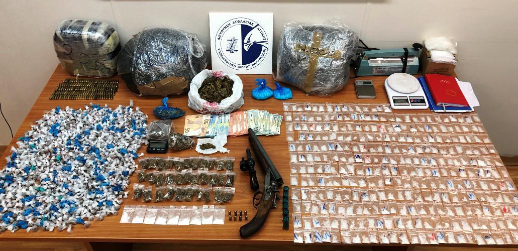 Συγκεκριμένα, ηρωίνη βάρους 1.242 γραμμαρίων σε 1.011 συσκευασίες, κοκαΐνη βάρους 116 γραμ. σε 10 συσκευασίες, κρυσταλλική μεθαμφεταμίνη 370 γραμ. σε 302 συσκευασίες και ακατέργαστη κάνναβη 6.647,1 γραμ. σε 39 συσκευασίες. Παράλληλα, βρέθηκαν και κατασχέθηκαν, μεταξύ άλλων, περίστροφο, κομμένο δίκαννο κυνηγετικό όπλο, 158 φυσίγγια και το χρηματικό ποσό των 1.255 ευρώ.