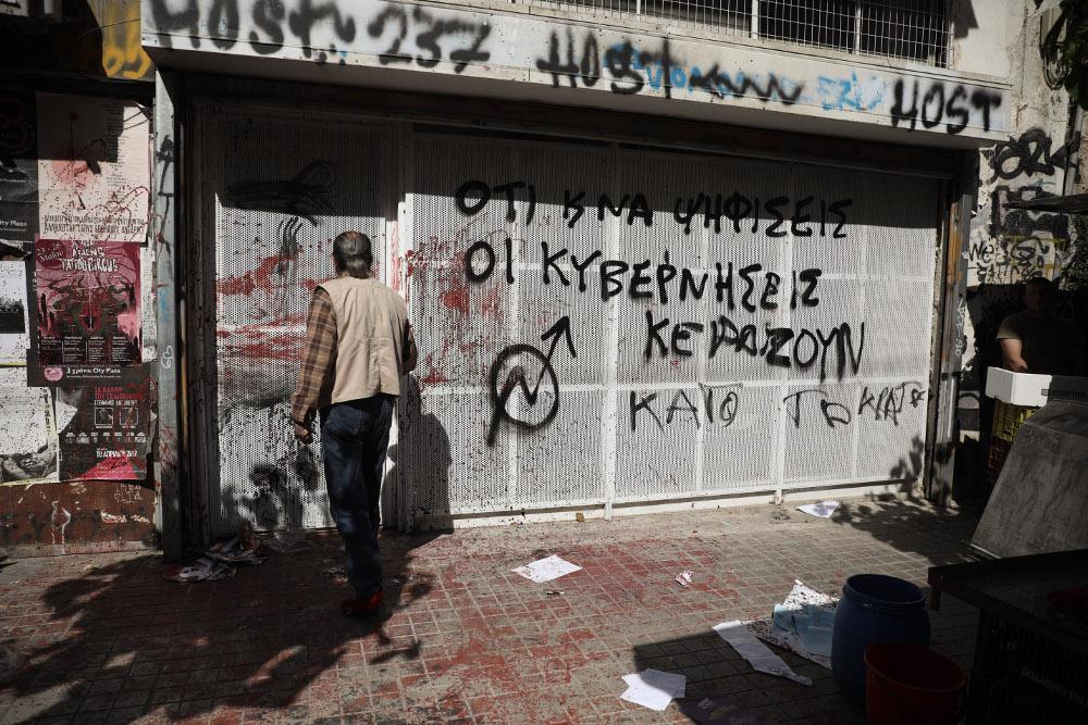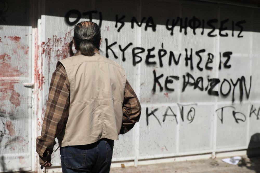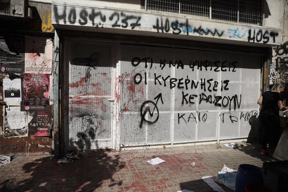 Τα 20 άτομα επιτέθηκαν με μπογιές στα γραφεία του κυβερνώντος κόμματος στην οδό Καλλιδρομίου 54.