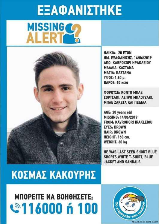 «Στις 14/6/2019, στις 21:00 ώρα, εξαφανίστηκε από την περιοχή του Καβροχωρίου Ηρακλείου Κρήτης, ο Κοσμάς Κακούρης 20 ετών. Ο Κοσμάς Κακούρης έχει ύψος 1,60μ., ζυγίζει 60 κιλά, έχει καστανά μαλλιά και καστανά μάτια. Για την εξαφάνιση του Κοσμά Κακούρη ενημερωθήκαμε σήμερα απογευματινές ώρες και κατόπιν Εισαγγελικής Εντολής προβήκαμε στη δημοσιοποίηση των στοιχείων του Κοσμά Κακούρη καθώς ενδέχεται συντρέχουν λόγοι οι οποίοι να θέτουν την ζωή του σε κίνδυνο.