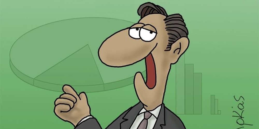 Στο πρώτο σκίτσο, ο αρχηγός της ομάδας εξηγεί στους παίκτες ότι θα λένε πως χάνουν 0-10 και όχι 10 – 0 και στο δεύτερο σκίτσο επισημαίνει πως το 20% των ερωτηθέντων βλέπουν ότι πηγαίνει καλά η οικονομία καθώς οι υπόλοιποι δεν… πίνουν!