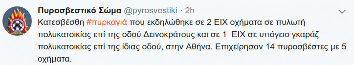 Σύμφωνα με ενημέρωση του Πυροσβεστικού Σώματος η πρώτη πυρκαγιά ξέσπασε σε πυλωτή πολυκατοικίας, ενώ η δεύτερη σε υπόγειο γκαράζ. Οι πύρινες εστίες έγιναν γρήγορα αντιληπτές από κατοίκους οι οποίοι ειδοποίησαν την Πυροσβεστική. Στα σημεία έσπευσαν άμεσα 14 πυροσβέστες με 5 οχήματα.