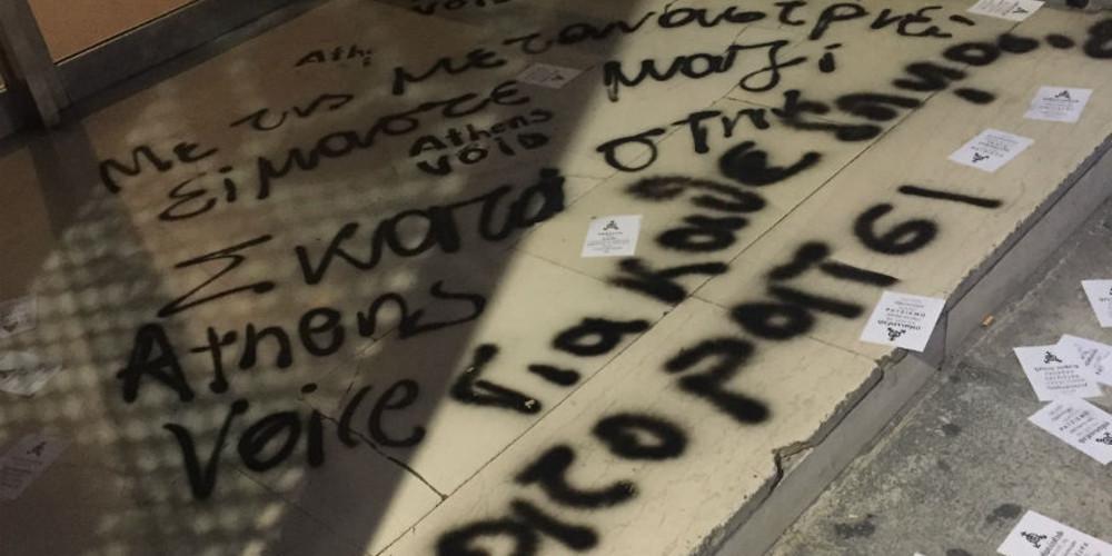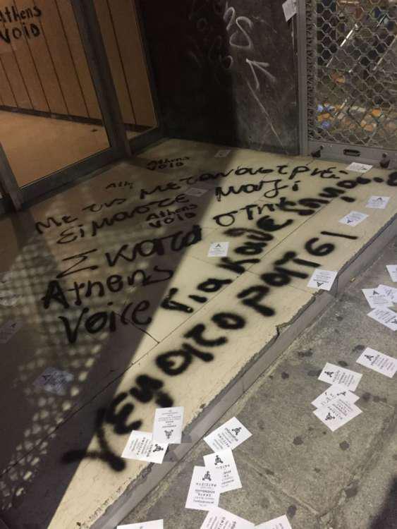 Με σπρέι έγραψαν συνθήματα και πέταξαν τρικάκια στα οποία αναγράφονταν οι φράσεις: «Για κάθε δημοσίευμα γεμάτο ρατσισμό απέναντί σας θα έχετε τον φεμινισμό» και «Με τις μετανάστριες είμαστε μαζί, σκατά στην Athens Voice και κάθε ρατσιστή».