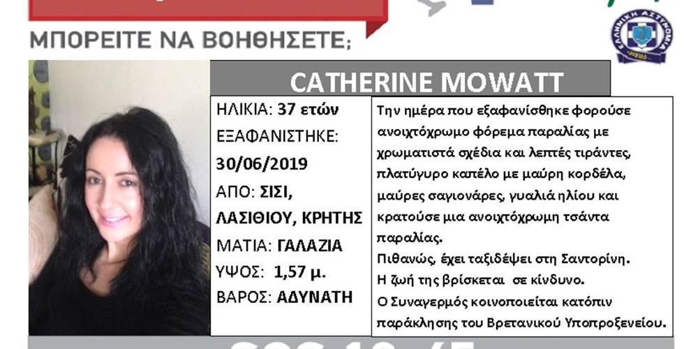 Πρόκειται για την Katherine Nowatt, που έχει να δώσει 10 μέρες σημεία ζωής. H 37χρονη εθεάθη την τελευταία φορά με φόρεμα παραλίας στο Σίσι Λασιθίου την Πέμπτη 30 Ιουνίου και εκτότε δεν υπάρχει κανένα νέο της. Για την 37χρονη εκδόθηκε μήνυμα silver alert μετά από παράκληση του βρετανικού υποπροξενείου, ενώ πιστεύεται ότι η ζωή της βρίσκεται σε κίνδυνο.