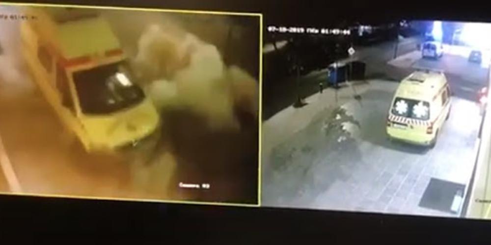 Όπως φαίνεται και στο βίντεο, που εξασφάλισε το bloko.gr η έκρηξη τής βόμβας προκάλεσε υλικές ζημιές στο σταθμευμένο ασθενοφόρο, που ήταν στην είσοδο τού κτιρίου.