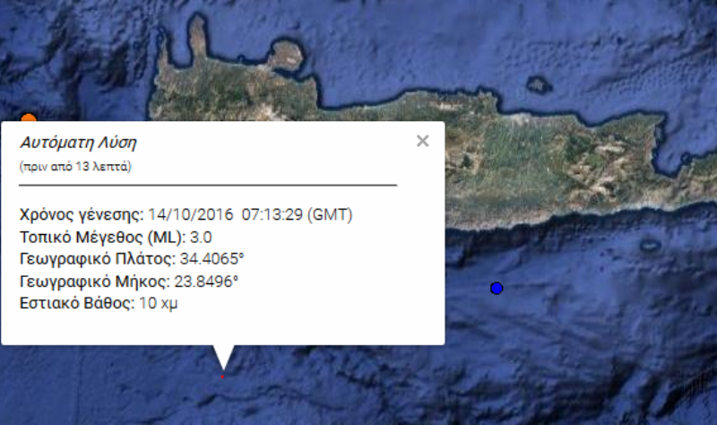 Λίγες ώρες νωρίτερα είχε καταγραφεί άλλη μια δόνηση μεγέθους 2,6 βαθμών της κλίμακας Ρίχτερ δυτικά των Χανίων και πάλι σε θαλάσσια περιοχή.