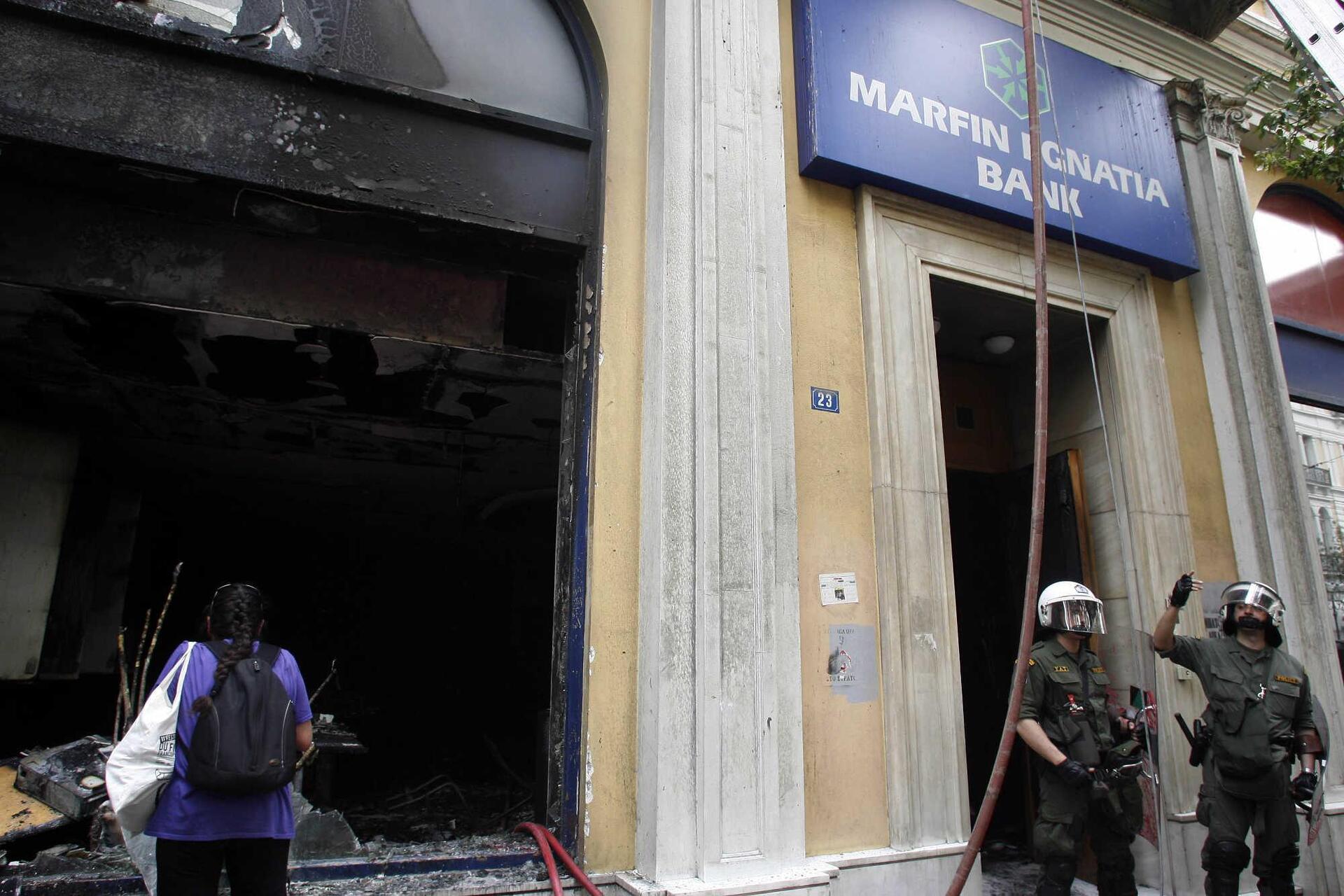 Από τη φωτιά που ξέσπασε στο υποκατάστημα της τράπεζας Marfin, έχασαν τη ζωή τους τρία άτομα -μεταξύ των οποίων και η Αγγελική Παπαθανασοπούλου, η οποία βρισκόταν σε προχωρημένη εγκυμοσύνη.
