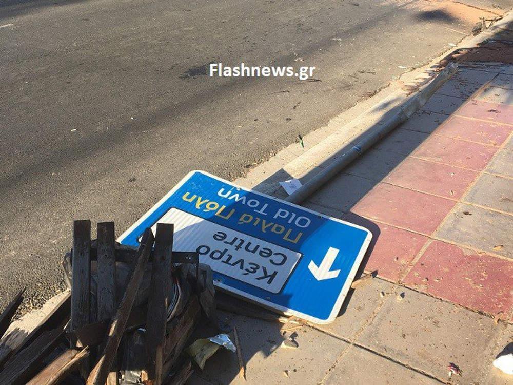 Η σύγκρουση ήταν τόσο σφοδρή, που ξεκόλλησε ακόμη και η πινακίδα που βρισκόταν σε εκείνο το σημείο στο πεζοδρόμιο.