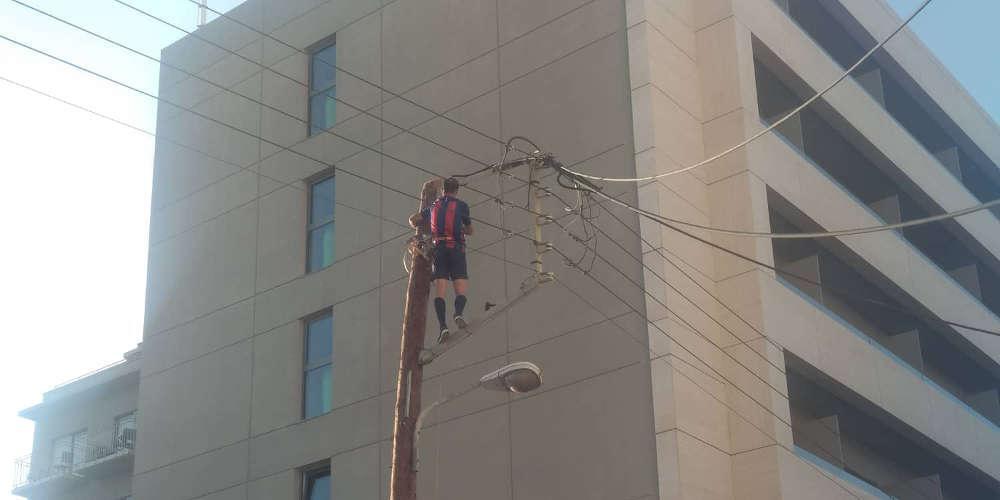 Ένας άνδρας, φορώντας αθλητικά – ποδοσφαιρικά ρούχα, ξεκίνησε να σκαρφαλώνει – χωρίς κανέναν λόγο και χωρίς τη λήψη κάποιου μέτρου προστασίας – σ ‘ έναν από τους στύλους της ΔΕΗ.