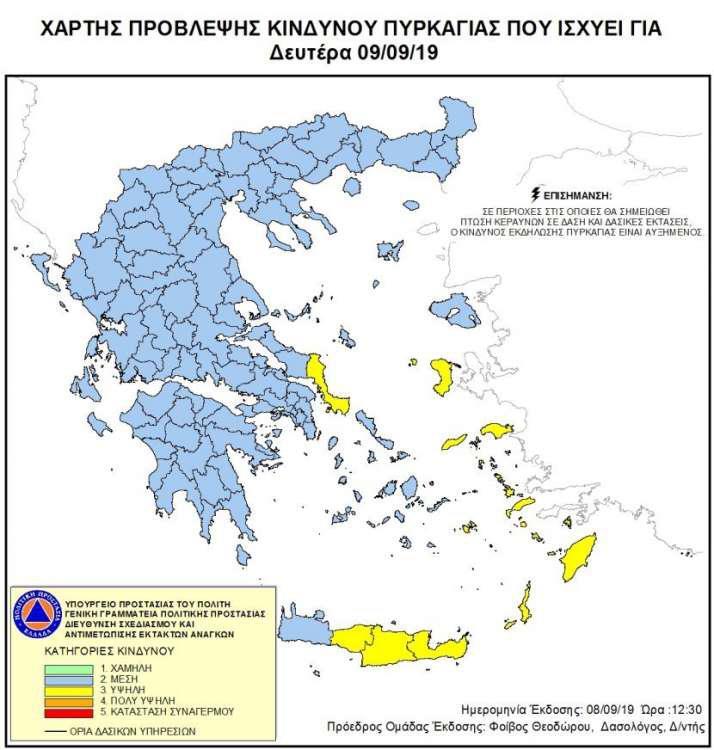Σύμφωνα με τον χάρτη της Πολιτικής Προστασίας οι περιοχές που διατρέχουν μεγάλο κίνδυνο είναι η Νότια Εύβοια, η Χίος, η Σάμος, η Ικαρία, τα Δωδεκάνησα και η Κρήτη.