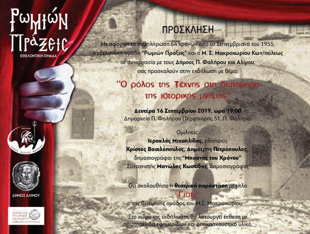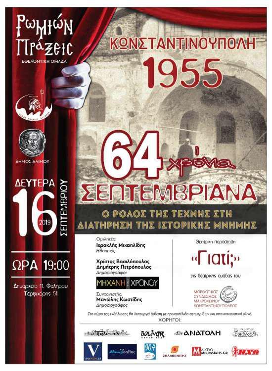 Η εκδήλωση θα πραγματοποιηθεί τη Δευτέρα 16 Σεπτεμβρίου 2019, ώρα 19:00, στο Δημαρχείο Π. Φαλήρου (Τερψιχόρης 51). Στη συζήτηση που θα συντονίσει ο δημοσιογράφος Μανώλης Κωστίδης ομιλητές θα είναι οι δημοσιογράφοι κκ. Χρ. Βασιλόπουλος και Δ. Πετρόπουλος, οι οποίοι θα παρουσιάσουν αποσπάσματα της δημοσιογραφικής τους έρευνα από την εκπομπή «Μηχανή του Χρόνου», καθώς και ο ηθοποιός Ιεροκλής Μιχαηλίδης. Ακολούθως, ο Μ. Σ Μακροχωρίου Κων/πόλεως «Το Έβδομον του Βυζαντίου» θα παρουσιάσει τη θεατρική παράσταση «Γιατί;» με θέμα εμπνευσμένο από τα Σεπτεμβριανά και αφηγητή τον δημοσιογράφο και εκδότη κ. Αλέκο Παπαδόπουλο.