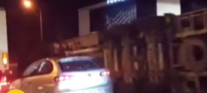 Η νταλίκα ντελαπάρισε για άγνωστους λόγους και δεν έχει απομακρυνθεί ακόμη από το οδόστρωμα με αποτέλεσμα να έχουν δημιουργηθεί τεράστιες ουρές οχημάτων στο ρεύμα της ανόδου.