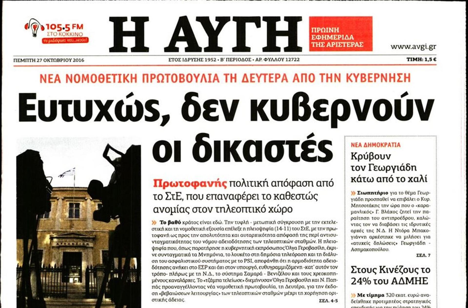 Η εφημερίδα έχει στο πρωτοσέλιδό της τον τίτλο «Ευτυχώς, δεν κυβερνούν οι δικαστές», κάνοντας λόγο για «πρωτοφανή πολιτική απόφαση του ΣτΕ που επαναφέρει το καθεστώς ανομίας στον τηλεοπτικό χώρο».