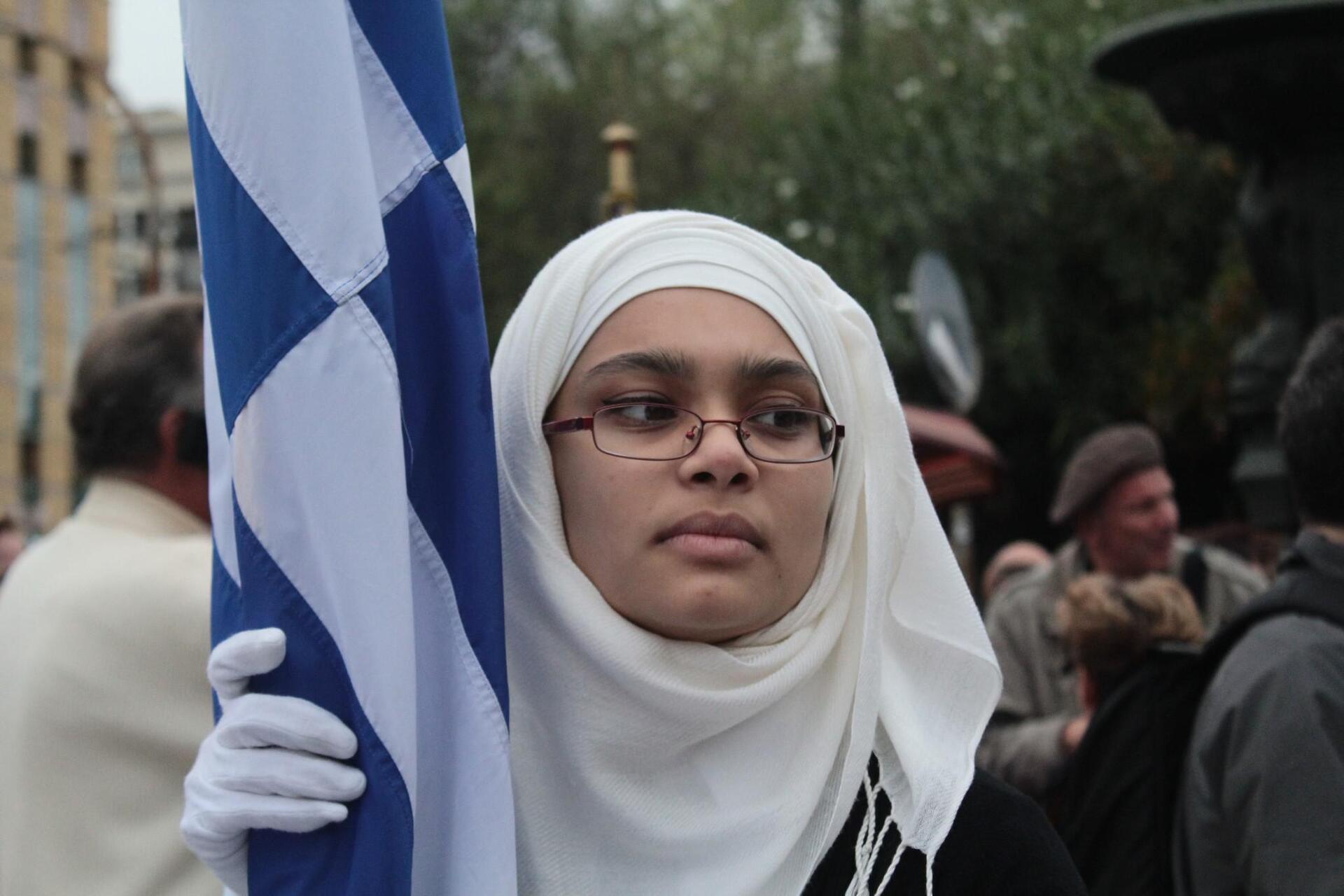 Εκτός από τη μαντίλα, φορούσε παντελόνι και ζακέτα κρύβοντας κάθε σημείο του σώματός της, την ώρα που οι συμμαθήτριές της έκαναν παρέλαση με κοντές φούστες και πουκάμισα αλλά πήρε το αυθόρμητο χειροκρότημα όλων όσων την παρακολουθούσαν να σηκώνει με καμάρι την ελληνική σημαία.