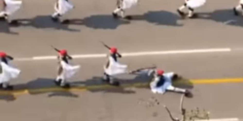 Ο τσολιάς γλίστρησε κατά τον βηματισμό του επάνω στην κίτρινη διαχωριστική γραμμή καθώς τα καρφιά του τσαρουχιού με το υλικό βαφής της λωρίδας απεδείχθη… μοιραίος συνδυασμός. Ο εύζωνας έπεσε στο οδόστρωμα. Αμέσως έσπευσε κοντά του ο επικεφαλής της Διμοιρίας των Ευζώνων προκειμένου να τον βοηθήσει, ενώ ο κόσμος χειροκρότησε έντονα θέλοντας να τον εμψυχώσει.