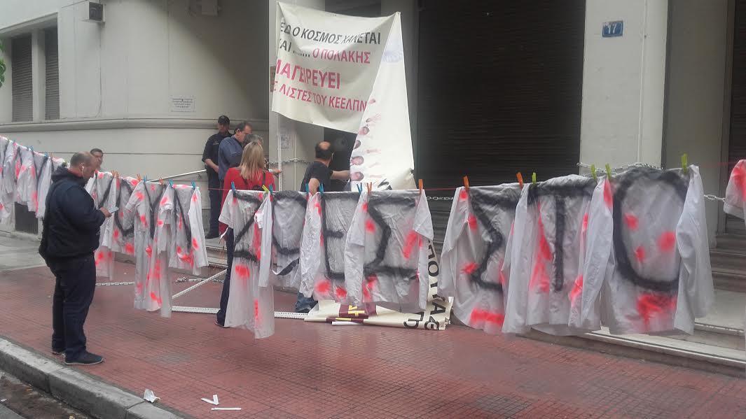 Μάλιστα από το πρωί μέλη της Ένωσης Νοσηλευτών Ελλάδας έχουν κρεμάσει πανό με «ματωμένες» ποδιές -βαμμένες με κόκκινο χρώμα- έξω από το υπουργείο Υγείας.