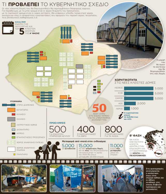 Η βασικότερη αλλαγή με συνέπειες σε πολλαπλά επίπεδα είναι η κατασκευή νέων κλειστών δομών στα νησιά, οι οποίες θα αντικαταστήσουν τα ανοιχτά Κέντρα Υποδοχής και Ταυτοποίησης. Συγκεκριμένα σε Λέσβο, Χίο και Σάμο κλείνουν οι υπάρχουσες δομές και δημιουργούνται νέες, ενώ σε Λέρο και Κω τα υπάρχοντα ΚΥΤ θα αναδιαμορφωθούν ώστε να γίνουν «κλειστά». Το μήνυμα που θέλει να στείλει η κυβέρνηση στα δουλεμπορικά κυκλώματα είναι ότι το καθεστώς στην Ελλάδα αλλάζει και πλέον αυστηροποιούνται όλες οι διαδικασίες. Στα κλειστά κέντρα θα οδηγούνται όλοι οι μετανάστες που θα φτάνουν στα νησιά, δεν θα έχουν δικαίωμα να εξέρχονται από αυτά, ενώ τα μέτρα ασφάλειας και φύλαξης θα είναι ενισχυμένα. Εκεί θα ταυτοποιούνται και όσοι θέλουν να κάνουν αίτηση χορήγησης διεθνούς προστασίας, θα χωρίζονται ανά ομάδες (ανήλικοι, μητέρες με παιδιά, ενήλικοι άντρες) και θα εξετάζονται τα αιτήματα με βάση τις νέες προτεραιότητες που έθεσε ο νέος νόμος. Με γρήγορες διαδικασίες θα εξετάζονται οι αιτήσεις όσων στα έγγραφά τους φαίνεται πως δεν δικαιολογείται η χορήγηση ασύλου. Ετσι, ο αριθμός των επιστροφών, απελάσεων και επανεισδοχών θα αυξηθεί και οι διαδικασίες θα ξεκινούν άμεσα από εκεί. Σε αυτό θα ενισχύσουν και τα ταχεία κλιμάκια εξέτασης ασύλου, για τα οποία ήδη έχουν ξεκινήσει προσλήψεις, όπως και οι συνοροφύλακες.