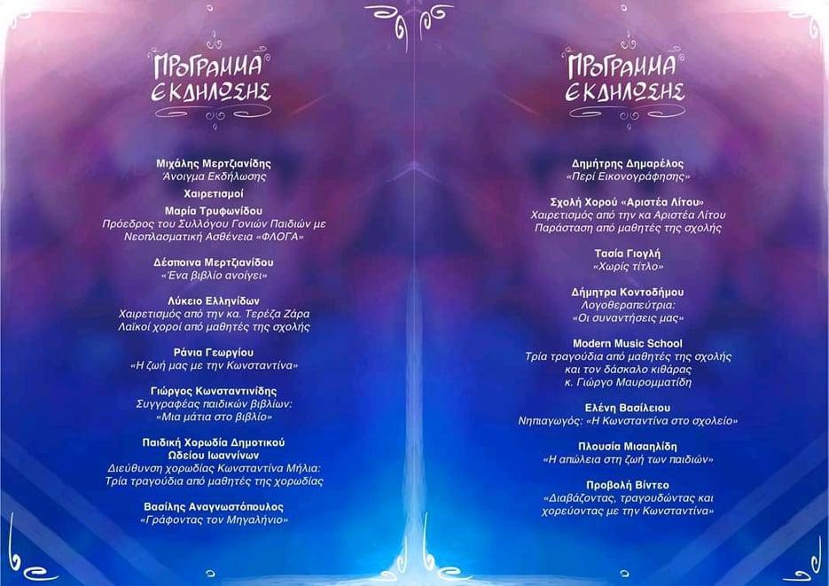 «Ανοίγουμε την αγκαλιά μας και με αποσκευές μας λίγο φως και ένα κομμάτι ουράνιου τόξου, ταξιδεύουμε! Στη χώρα των ονείρων! Πάνω σε μια αρκούδα! Πέρα από τ’ αστέρια! Στον υπέροχο κόσμο της φαντασίας της Κωνσταντίνας! Μαζί μας στο ταξίδι μαθητές και δάσκαλοι του Λυκείου Ελληνίδων, της Παιδικής Χορωδίας του Δήμου Ιωαννιτών, της Σχολής Χορού «Αριστέα Λίτου» και του Modern Music School, θα ενώνουν τ’ άστρα… με μια κιμωλία… με χορό και τραγούδι! Για τους αμύητους θα δοθούν σχετικές οδηγίες ταξιδιού από τον έμπειρο στο είδος, συγγραφέα παιδικών βιβλίων, Γιώργο Κωνσταντινίδη και άλλους τολμηρούς ταξιδευτές, εξίσου ενθουσιώδεις…», αναφέρεται στη σχετική πρόσκληση.
