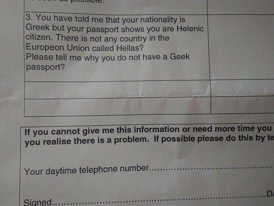 «Μας είπατε ότι η εθνικότητά σας είναι ελληνική (Greek), όμως το διαβατήριό σας δείχνει ότι είστε Έλληνας πολίτης (Helenic citizen). Δεν υπάρχει χώρα στην ΕΕ που αποκαλείται Hellas; Σας παρακαλώ πείτε μας γιατί δεν διαθέτετε ελληνικό διαβατήριο;»