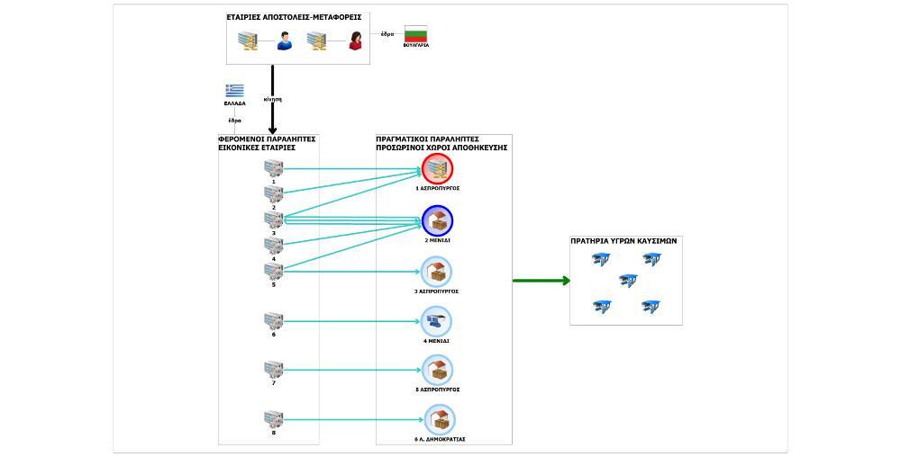 Οι διαλύτες από την Βουλγαρία, κατέληγαν σε δύο μεγάλες αποθήκες στον Ασπρόπυργο και στο Μενίδι Αττικής, που ήταν σε δυσπρόσιτες περιοχές, ενώ διέθεταν συστήματα παρακολούθησης με κάμερες για να είναι δύσκολο να τις πλησιάσει κανείς. Στη συνέχεια μεταφέρονταν στα 21 πρατήρια και αναμιγνύονταν με τα καθαρά καύσιμα τα οποία αγόραζαν οι ανυποψίαστοι καταναλωτές. Σε κάποιες περιπτώσεις, σύμφωνα με την Αστυνομία, μεταφέρονταν κατευθείαν στα πρατήρια.
