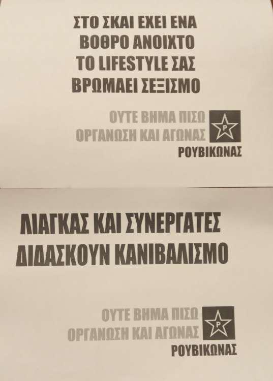 Σε κείμενο που ανάρτησε σε γνωστή ιστοσελίδα του αντιεξουσιαστικού χώρου o Ρουβίκωνας αναφέρει μεταξύ άλλων: Αυτά είναι τα πρότυπα που επιλέγει να αναδείξει συνολικά το «star system», ένα κανιβαλικό σύστημα που θα μας βρίσκει πάντοτε απέναντι, με όσες δυνάμεις διαθέτουμε. Η παρέμβαση στο σπίτι του Λιάγκα και τα όσα επιλέξαμε να του μεταφέρουμε μέσω του γραπτού λόγου, θεωρούμε ότι είναι μία από αυτές τις στιγμές αντίστασης και καθημερινού φεμινιστικού αγώνα.