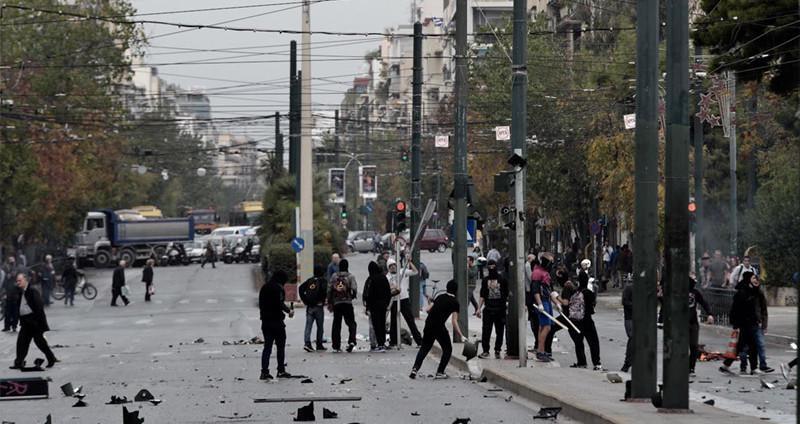 Ομάδα αντιεξουσιαστών έχει ανάψει φωτιές και πετάει αντικείμενα, ενώ καταστρέφει ό,τι βρει μπροστά της.