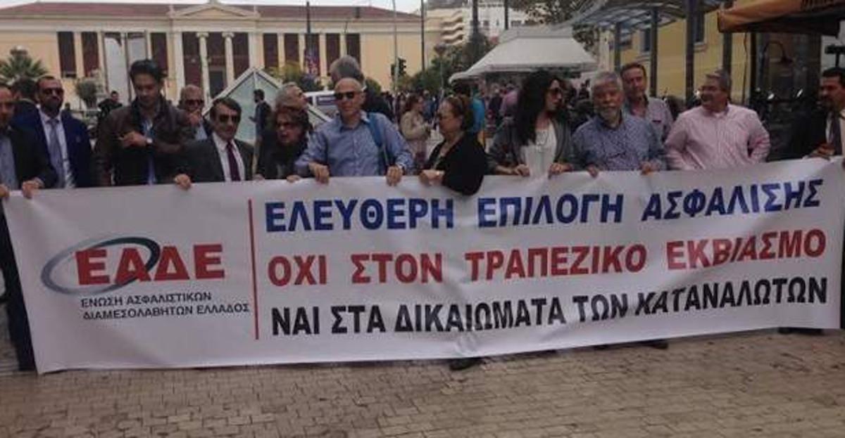 Με ένα πανό που έγραφε «Ελεύθερη Επιλογή Ασφάλισης, Όχι Στον Τραπεζικό Εκβιασμό, Ναι Στα Δικαιώματα Των Καταναλωτών», οι ασφαλιστές απέκλεισαν συμβολικά τα υποκαταστήματα των τραπεζών ενημερώνοντας ταυτόχρονα τους πολίτες για τα δικαιώματα τους.