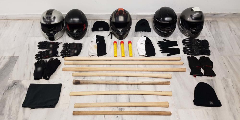 Κατασχέθηκαν, μεταξύ άλλων, ξύλινα αντικείμενα – κοντάρια, βεγγαλικά, κουκούλες τύπου full face , αντικείμενα με διακριτικά ομάδας