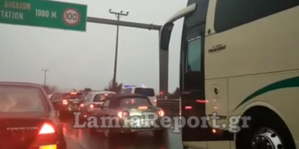 Το βίντεο είναι τραβηγμένο στο ρεύμα προς Λαμία, λίγο πριν τα διόδια των Αφιδνών, όπου εδώ και μιάμιση ώρα περίπου έχουν εγκλωβιστεί εκατοντάδες οδηγοί, όπως και στο ρεύμα προς Αθήνα, οι ουρές φτάνουν μέχρι τη Μαλακάσα.