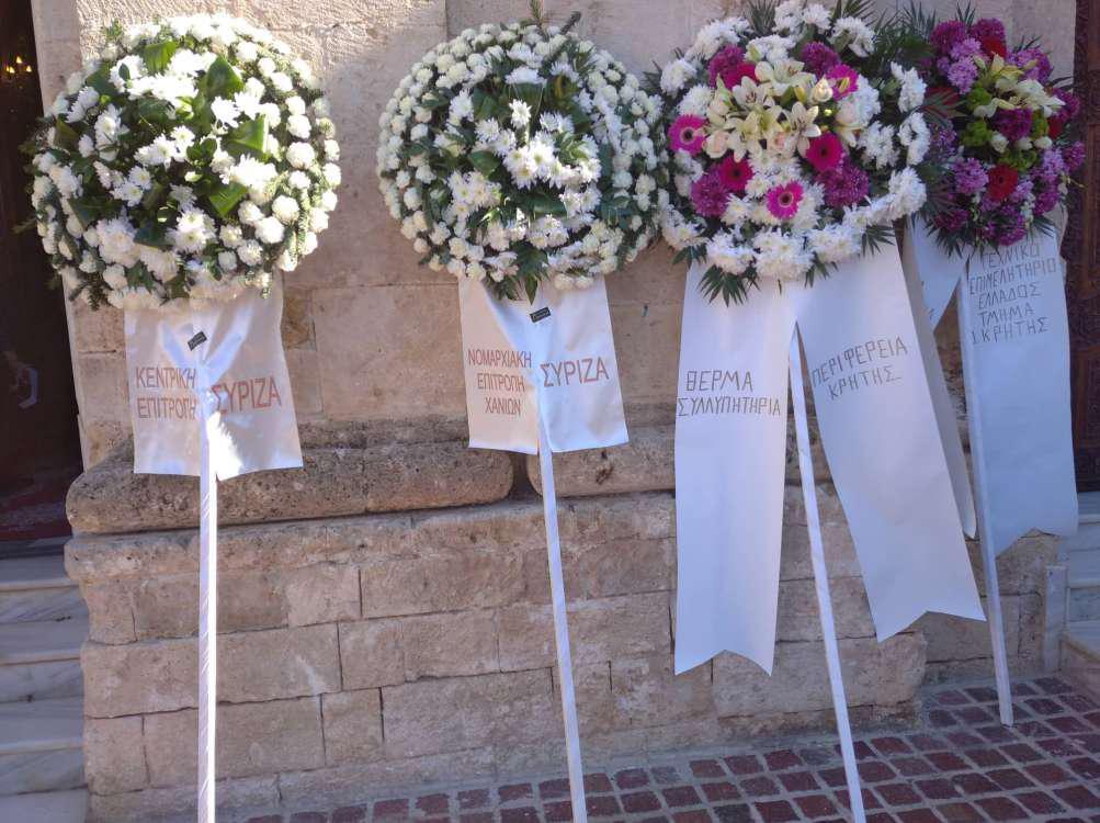 Στεφάνια στη μνήμη του εκλιπόντος απέστειλαν ο πρόεδρος του ΣΥΡΙΖΑ., Αλέξης Τσίπρας, ο πρώην πρόεδρος του Κοινοβουλίου, Νίκος Βούτσης, η κεντρική και Νομαρχιακή επιτροπή του κόμματος, η Περιφέρεια Κρήτης και το Τεχνικό Επιμελητήριο Κρήτης/Τμήμα Δυτικής Κρήτης.
