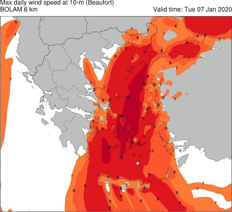 Παράλληλα, όπως φαίνεται και στον παρακάτω χάρτη για την Τρίτη 7/1, οι βόρειοι άνεμοι στο Αιγαίο θα συνεχίσουν να πνέουν με εντάσεις έως 10 μποφόρ. Σταδιακή εξασθένηση των ανέμων αναμένεται από την Τετάρτη 8/1: