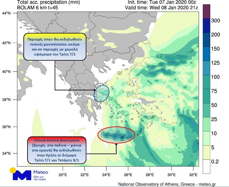 Στο χάρτη που ακολουθεί απεικονίζεται ο προβλεπόμενος συνολικός υετός (βροχή / χιόνι) έως το βράδυ της Τετάρτης 8/1, ενώ επισημαίνονται οι περιοχές όπου θα εκδηλωθούν τα σημαντικότερα φαινόμενα: