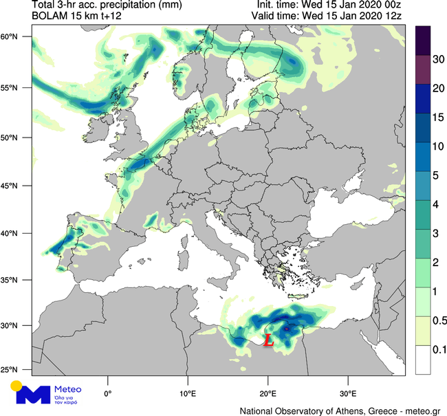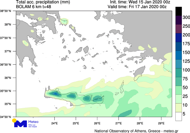 Σύμφωνα με τα τελευταία διαθέσιμα στοιχεία, κατά το υπόλοιπο της Τετάρτης 15/01, τοπικές βροχές θα σημειωθούν στα νοτιοανατολικά ηπειρωτικά και στο Νότιο Αιγαίο, οι οποίες στην Κρήτη και στα Δωδεκάνησα από το μεσημέρι θα είναι κατά τόπους ισχυρές και θα εκδηλωθούν και σποραδικές καταιγίδες. Την Πέμπτη, 16/01 βροχές θα σημειωθούν κυρίως στην Εύβοια, στην Κρήτη και στα Δωδεκάνησα, ενώ στις δύο τελευταίες περιοχές θα εκδηλωθούν και σποραδικές καταιγίδες. Στον χάρτη που ακολουθεί παρουσιάζεται ο ολικός υετός που αναμένεται στη νοτιοανατολική χώρα έως το βράδυ της Πέμπτης 16/01.