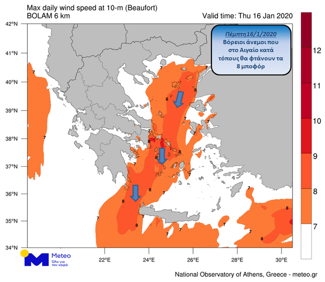Οι άνεμοι στο Αιγαίο την Τετάρτη 15/01 και την Πέμπτη 16/01 θα πνέουν από βόρειες και βορειοανατολικές διευθύνσεις και θα φτάνουν κατά τόπους τα 8 μποφόρ. Στο σχετικό χάρτη μπορείτε να δείτε τις περιοχές όπου ο άνεμος θα ξεπεράσει τα 7 μποφόρ την Πέμπτη 16/01.