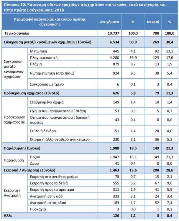 Ως προς τα ατυχήματα, η κατηγορία «σύγκρουση μεταξύ κινούμενων οχημάτων» σημείωσε το μεγαλύτερο ποσοστό (60,9%), με κυριότερο τύπο σύγκρουσης την «πλαγιομετωπική» (39,9%). Η δεύτερη σημαντικότερη κατηγορία ήταν η «παράσυρση πεζού» (18,1%) και ακολουθεί η «εκτροπή /ανατροπή οχήματος» (13,6%). Ως προς τους νεκρούς, η κατηγορία «σύγκρουση μεταξύ κινούμενων οχημάτων» σημείωσε το μεγαλύτερο ποσοστό 38,4% (269 νεκροί), με κυριότερο τύπο σύγκρουσης την «πλαγιομετωπική» με ποσοστό 17,6% (123 νεκροί). Η δεύτερη σημαντικότερη κατηγορία ήταν η «εκτροπή /ανατροπή οχήματος» με 28,6% (200 νεκροί) και ακολουθεί η «παράσυρση πεζού» με 21,3% (149 νεκροί).