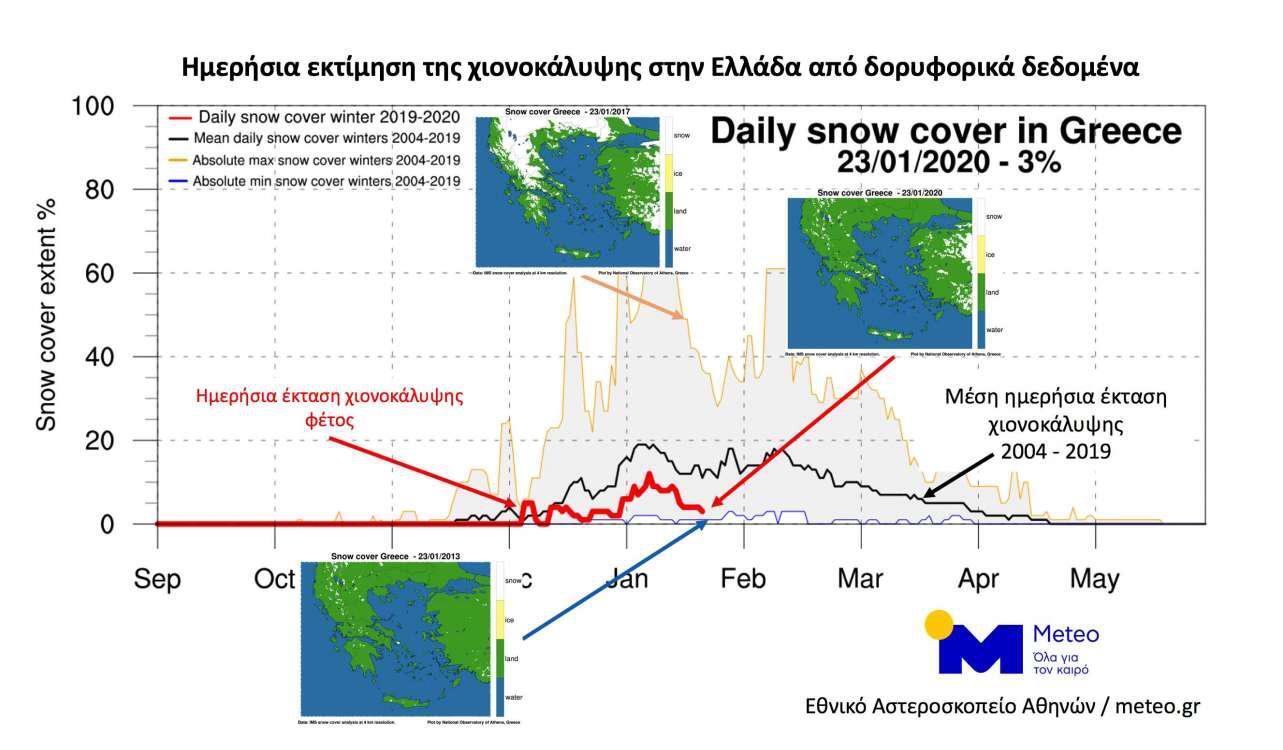 Το 2020 είναι ένα από τα έτη με την μικρότερη χιονοκάλυψη της περιόδου 2005-2020, σύμφωνα με το meteo του Εθνικού Αστεροσκοπείου Αθηνών.