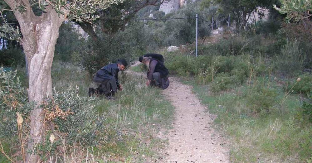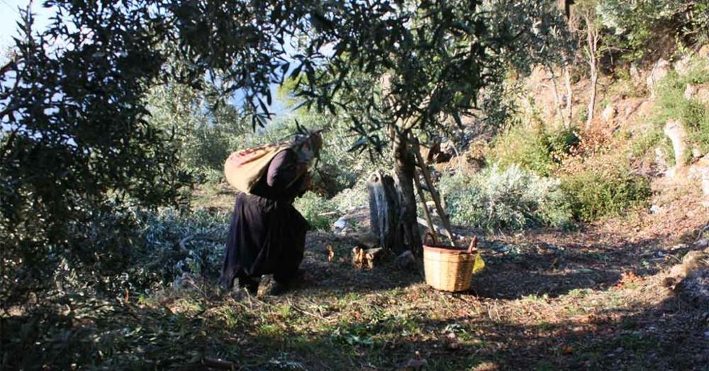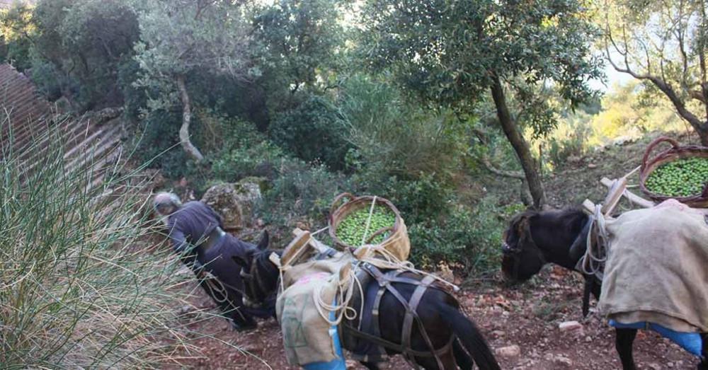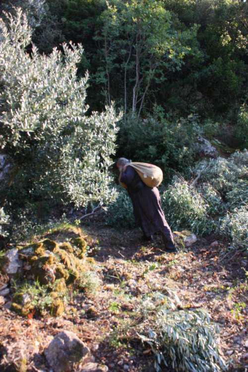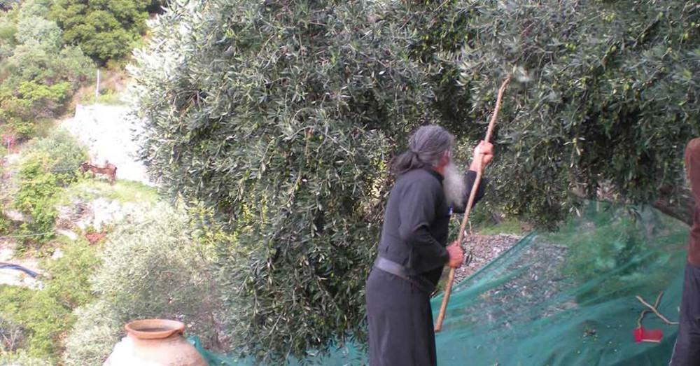Μηχανήματα και τρακτέρ είναι αδύνατο να φτάσουν στο συγκεκριμένο σημείο, οπότε οι ελιές σκαλίζονται και μαζεύονται μόνο με το χέρι, ενώ οι μοναχοί μεταφέρουν τα τσουβάλια με τον καρπό στην πλάτη τους μέχρι το σημείο που θα τα φορτώσουν στα μουλάρια. Από εκεί μέσω ενός μικρού μονοπατιού τα μουλάρια με το πολύτιμο φορτίο τους κατευθύνονται είτε στο ελαιοτριβείο της Σκήτης της Αγίας Άννης, που είναι το πιο κοντινό είτε στην παραλία για να σταλούν σε εξωτερικό ελαιοτριβείο.