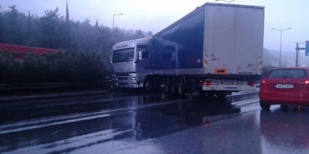 Ο οδηγός της νταλίκας έχασε τον έλεγχο του οχήματος εξαιτίας της ολισθηρότητας του δρόμου, έκανε περιστροφές και κατέληξε στο διαχωριστικό κιγκλίδωμα. Χρειάστηκε η επέμβαση της Πυροσβεστικής Υπηρεσίας προκειμένου να κοπούν οι προστατευτικές μπάρες που έπεσαν στο οδόστρωμα με αλυσοπρίονο και να απομακρυνθούν για να δοθούν και πάλι στην κυκλοφορία και τα δύο ρεύματα της εθνικής οδού.