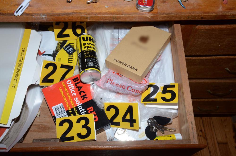 Κατά τη διάρκεια της έρευνας στο διαμέρισμα, όπως ανακοινώθηκε από την αστυνομία, μεταξύ άλλων, βρέθηκαν και κατασχέθηκαν: Δύο κάρτες μνήμης με δύο αντάπτορες, κάρτα SIM και στέλεχος κάρτας SIM, πολυμηχάνημα-εκτυπωτής, Tablet και τρία USB stick, συσκευή κινητής τηλεφωνίας και κάρτα SIM, ανταλλακτικά, αξεσουάρ και παρελκόμενα για Drone, πλήθος από σακούλες, καλώδια, ζελατίνες πλαστικοποίησης και κλειδιά, φωτογραφίες ταυτότητας του Ιωάννη Μιχαηλίδη, όμοιες με αυτή που υπήρχε σε πλαστό δελτίο ταυτότητας που κατείχε, πλήθος από ρούχα (ανδρικά και γυναικεία) και υποδήματα.